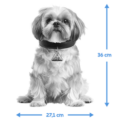 Der Hund ist 36 cm hoch und 27,1 cm breit. (Plus einen halben Zentimeter transparente Folie drumherum.)
